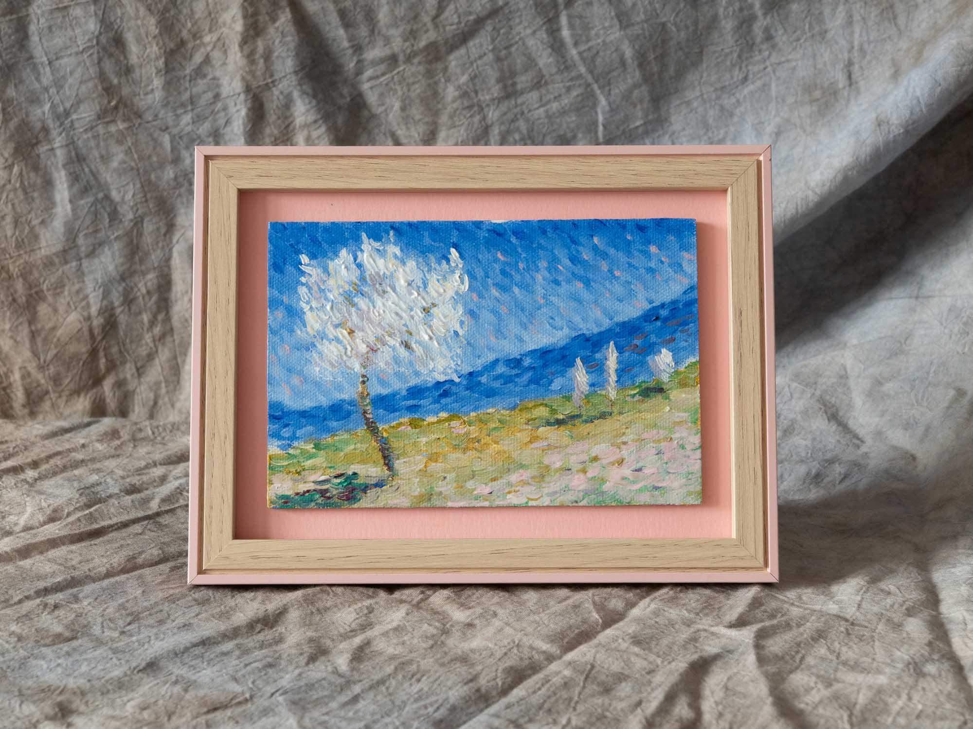 Obraz wykonany został farbami olejnymi na płótnie. Jest oprawiony w ramę 20x15 cm jak na zdjęciu.