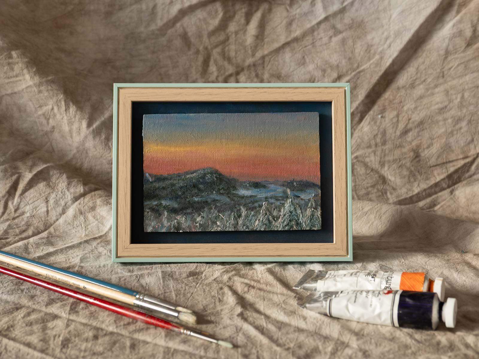 Technika: olej na płótnie Wymiary: 15x10cm Obraz jest oprawiony