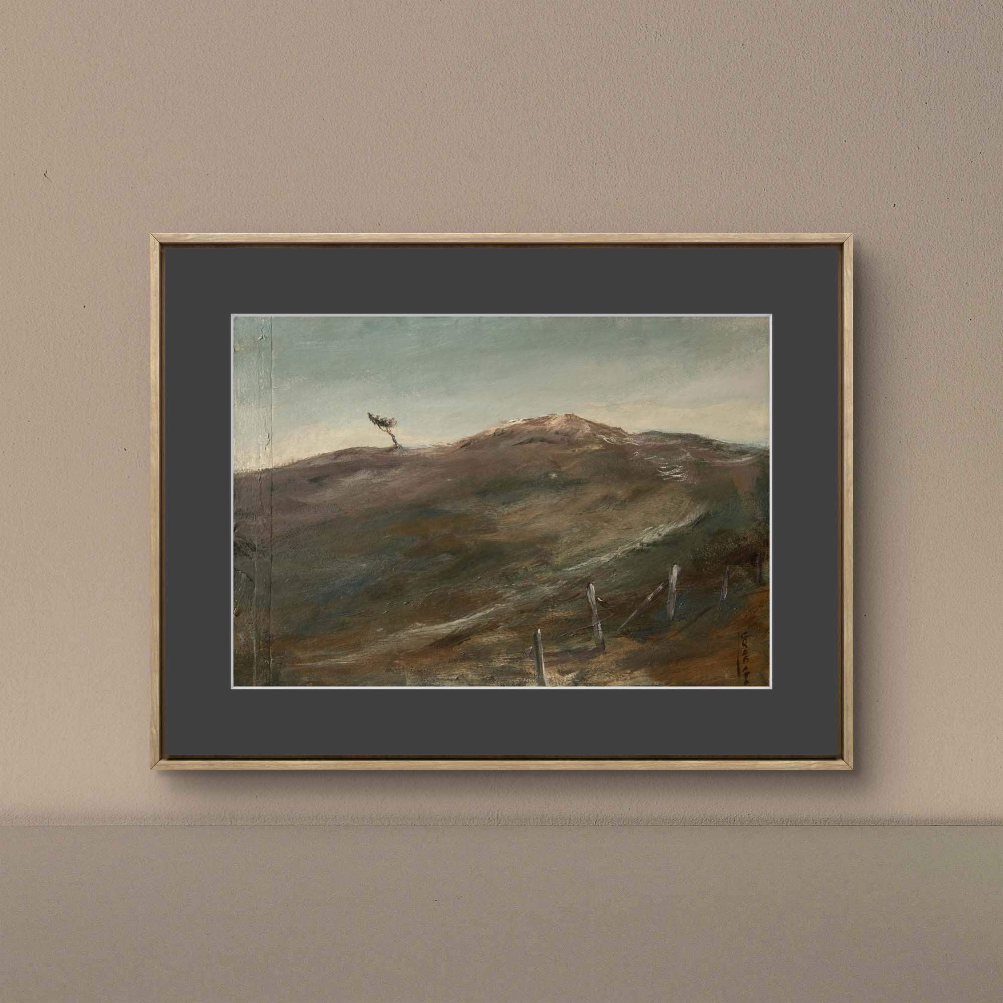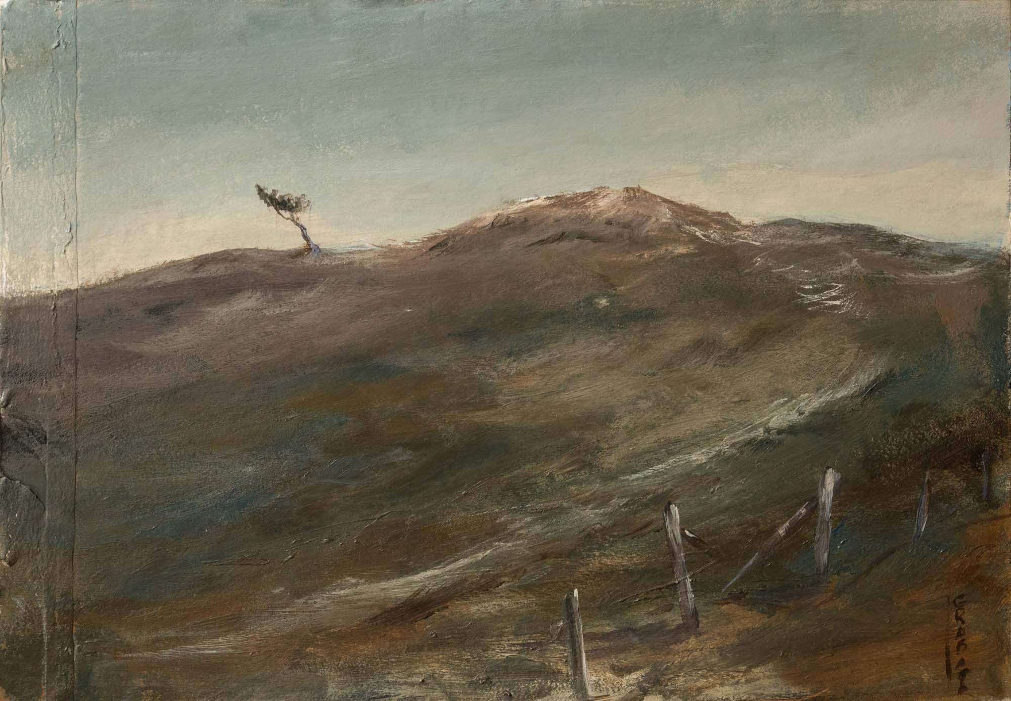 Obraz pejzaż inspirowany jest pracami Andrew Wyetha. Namalowany jest na tekturze - ostatniej stronie z bloku. Krzysiek Grabara uwielbia malować na tak nieoczywistych powierzchniach.