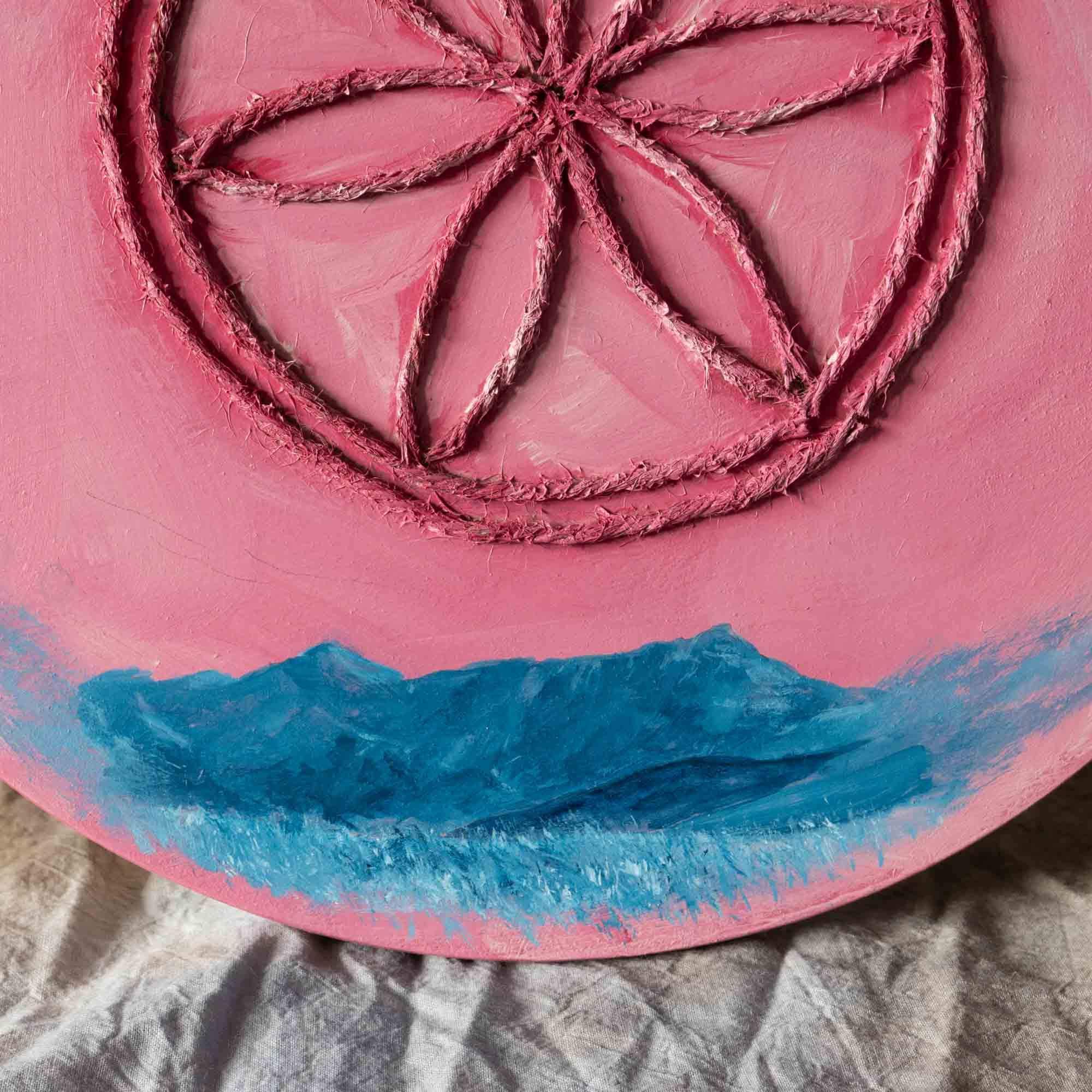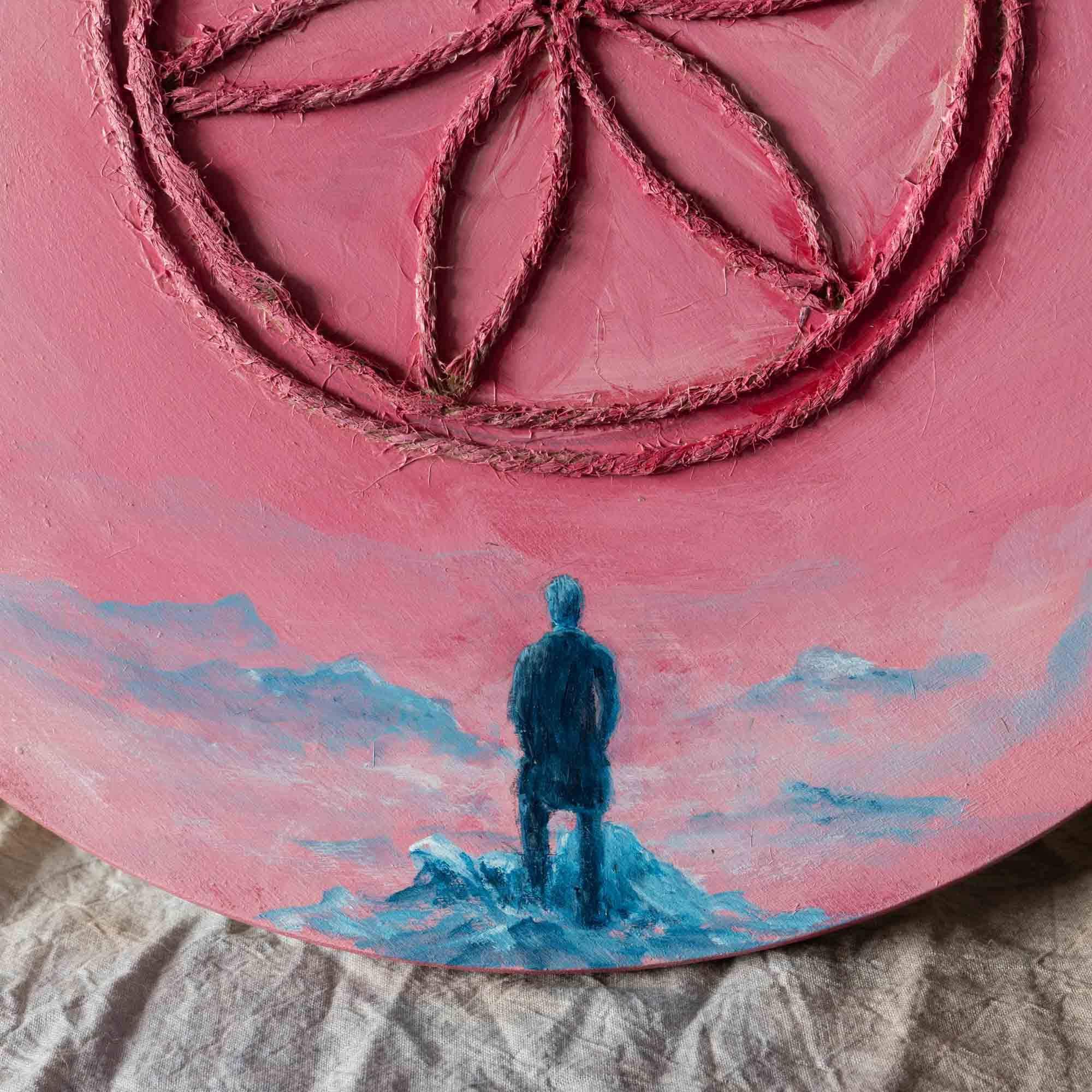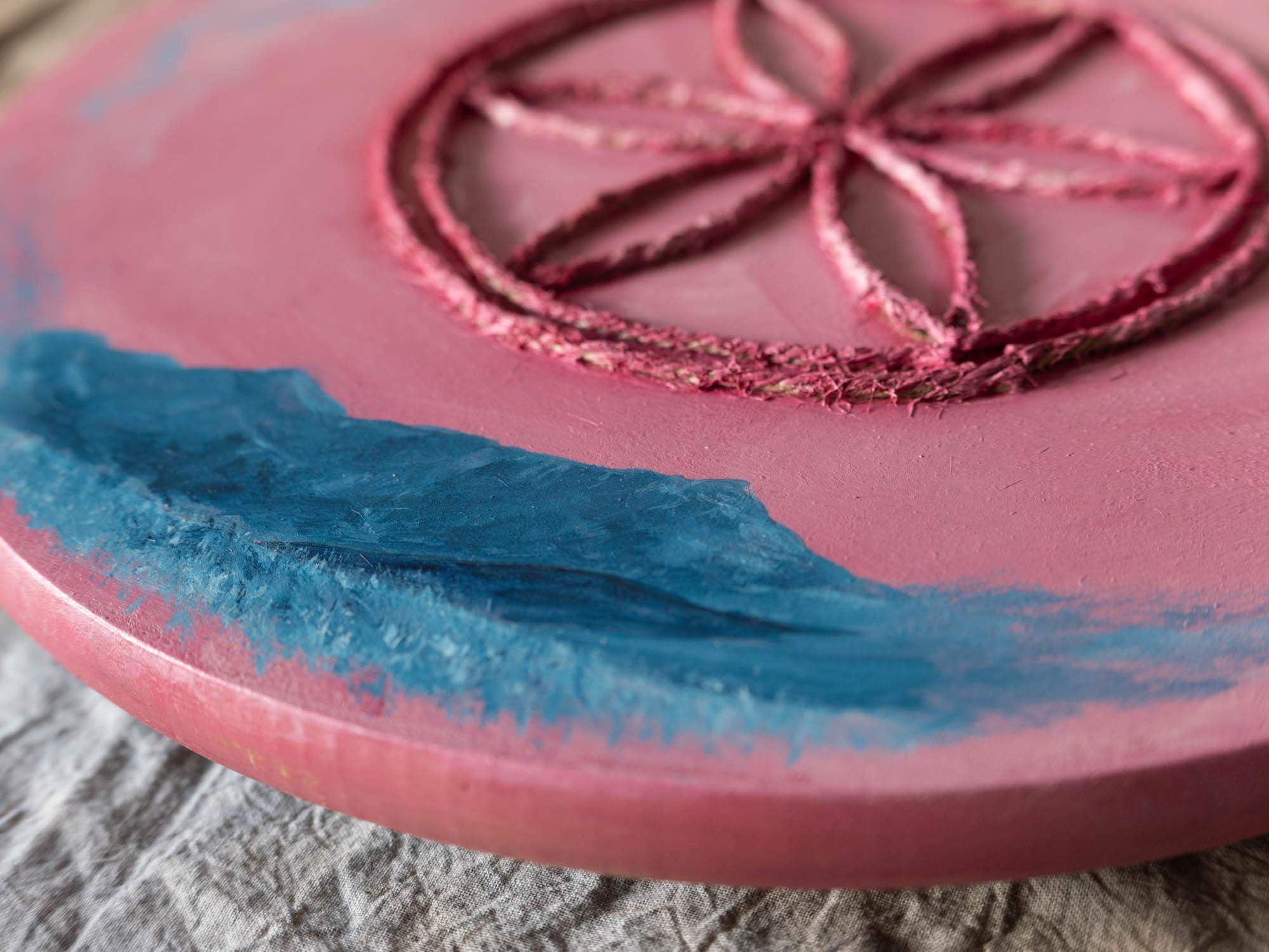 Dzieło wykonałem na obrotowej drewnianej paterze o średnicy 30cm z wykorzystaniem sznurka i farb akrylowych.