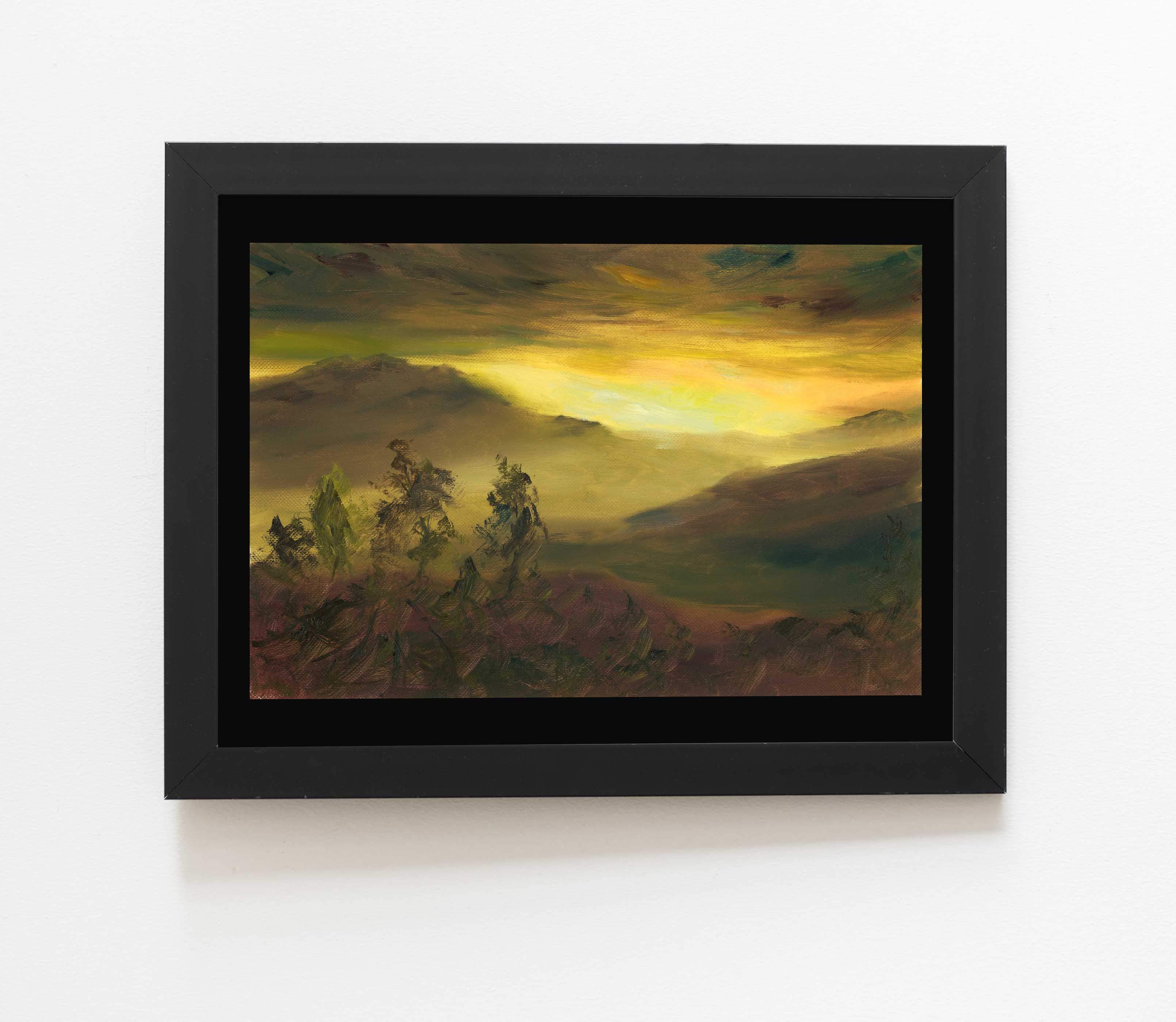 Obraz wykonany został farbami olejnymi przeznaczonym do tej techniki papierze. Jest oprawiony w czarną drewnianą ramę podobną do tej na zdjęciu.