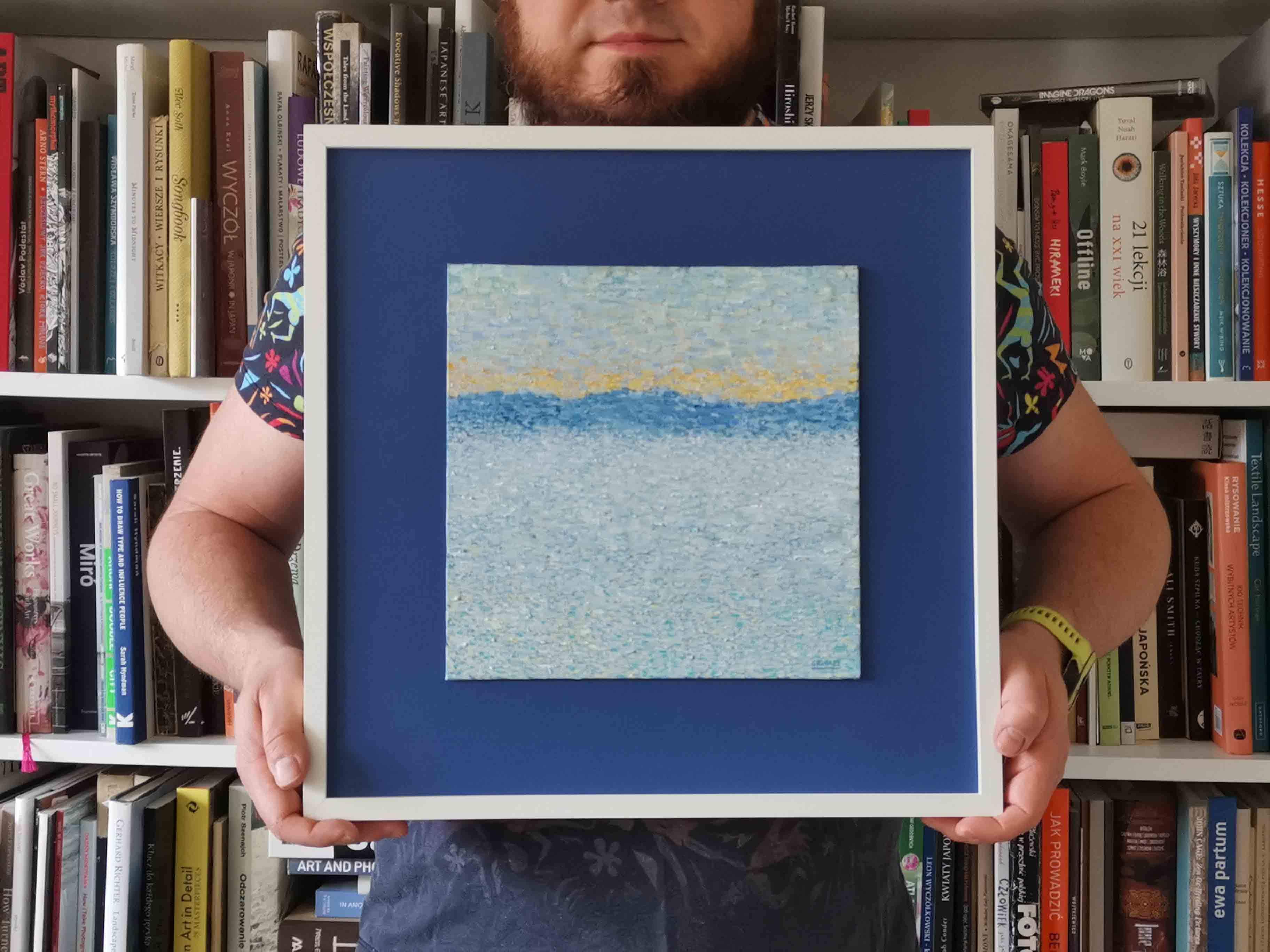 Pejzaż pointylistyczny op. 3 – morze chmur - 25x25cm Obraz wykonany został farbami akrylowymi na płótnie. Jest oprawiony w ramę 40x40cm w kolorze białym z niebieskim kartonem jako tło.