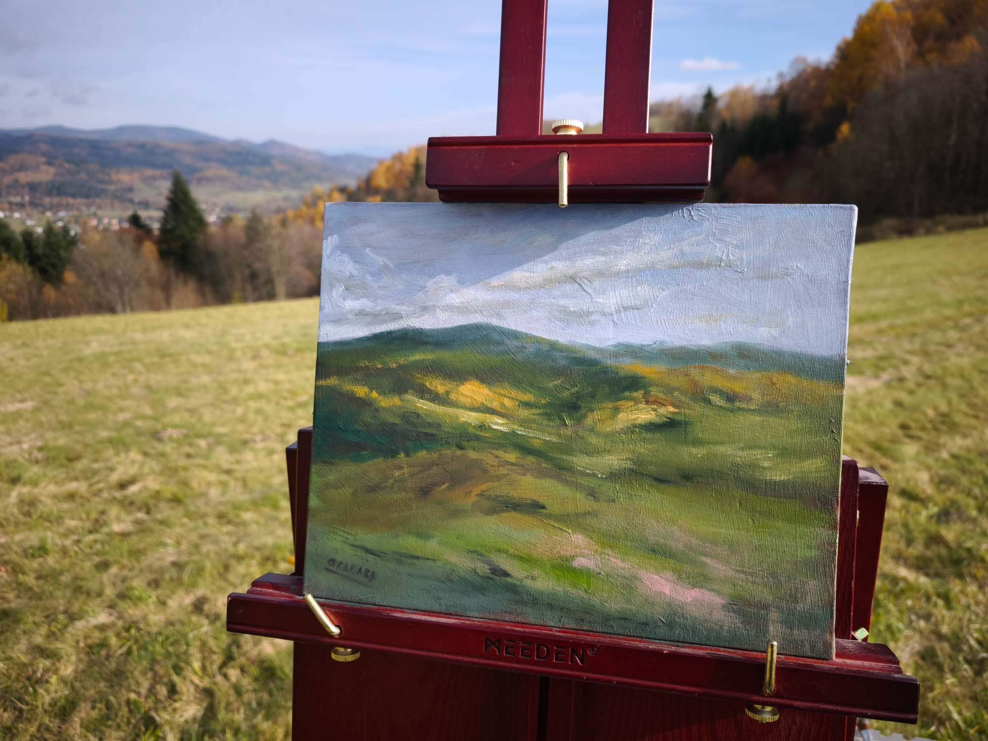 Obraz plenerowy - Barania Góra widziana z Lalik Jest to pierwszy plenerowy obraz artysty jaki powstał w Beskidzie.