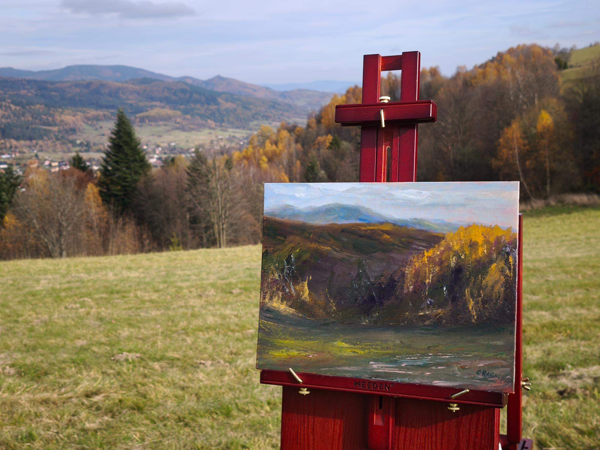 Obraz plenerowy - pasmo Baraniej Góry widziany z Lalik