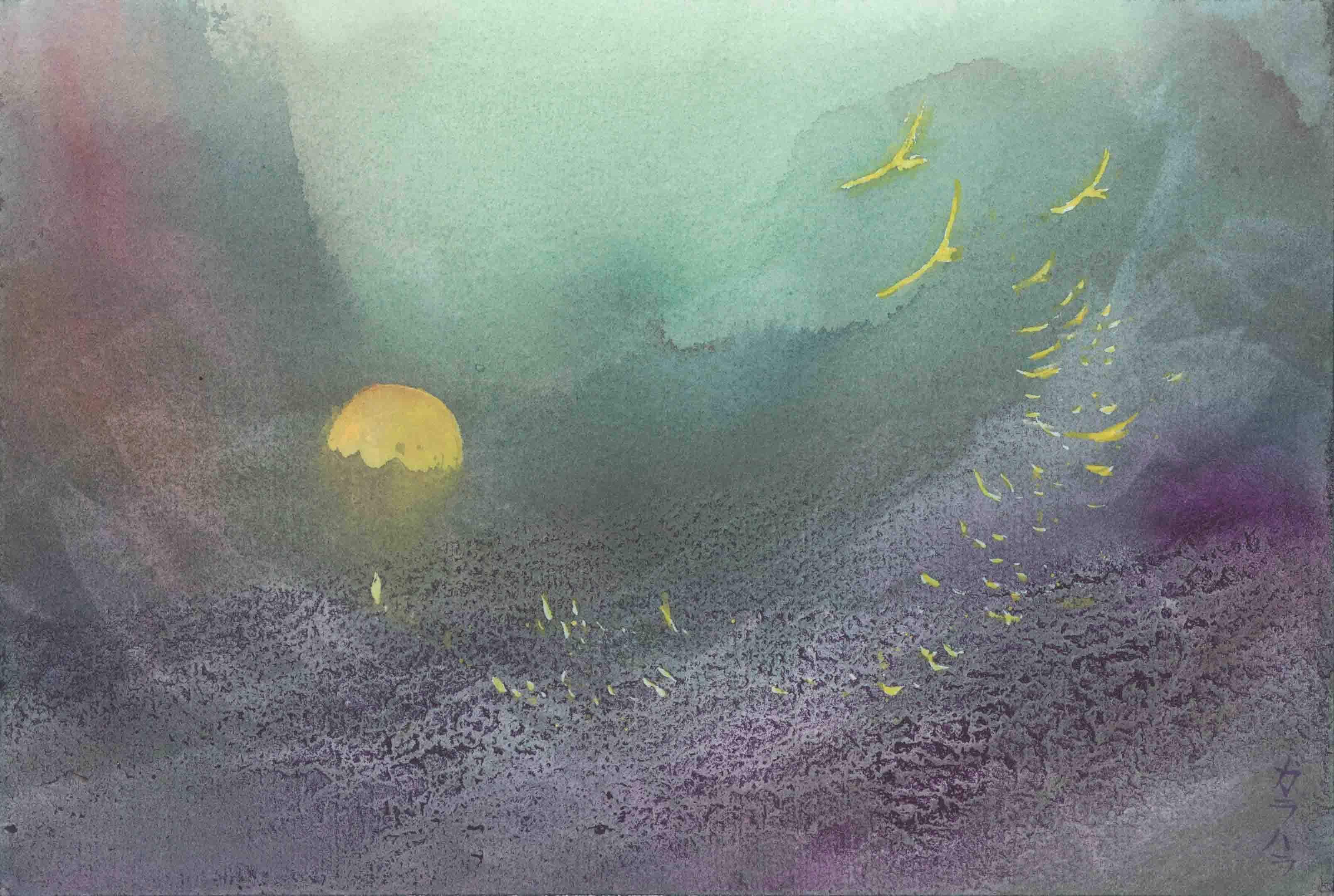 Ptaki - wschód księżyca - akwarela 30x21cm - Malarstwo spokoju.