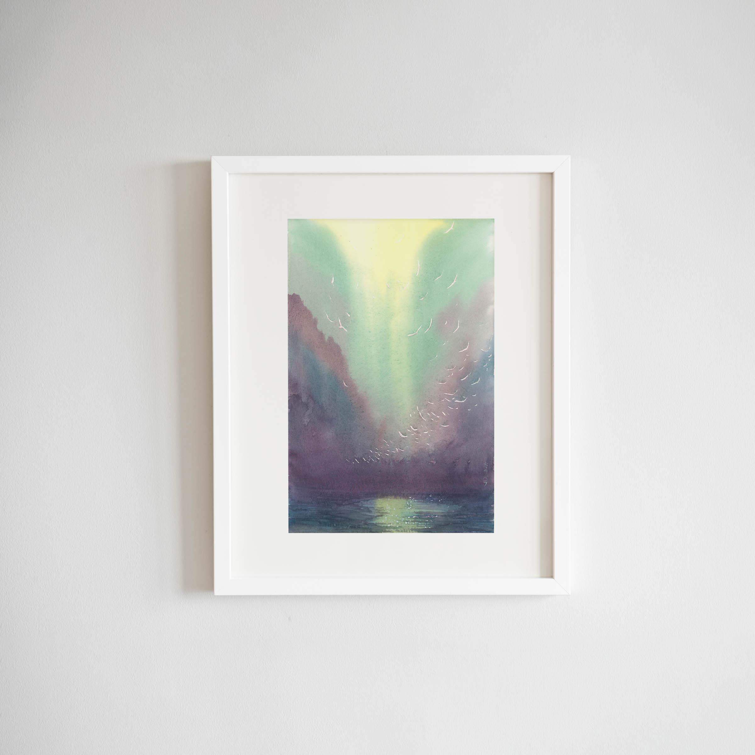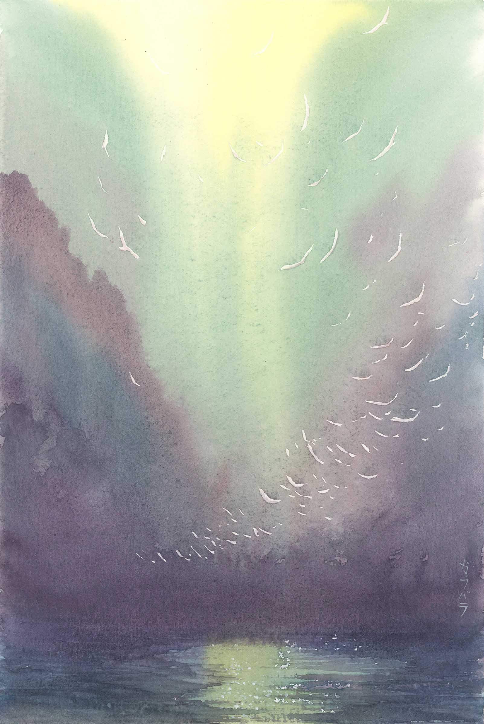 Ptaki i sposób w jaki maluje autorem otaczają spokojem i dają nadzieję. Wzlatują gdzieś w górę wplecione w oniryczny pejzaż. Obraz wykonany został farbami akwarelowymi na papierze przeznaczonym do tej techniki. Wymaga dodatkowej oprawy - zdjęcie z galerii jest poglądowe.