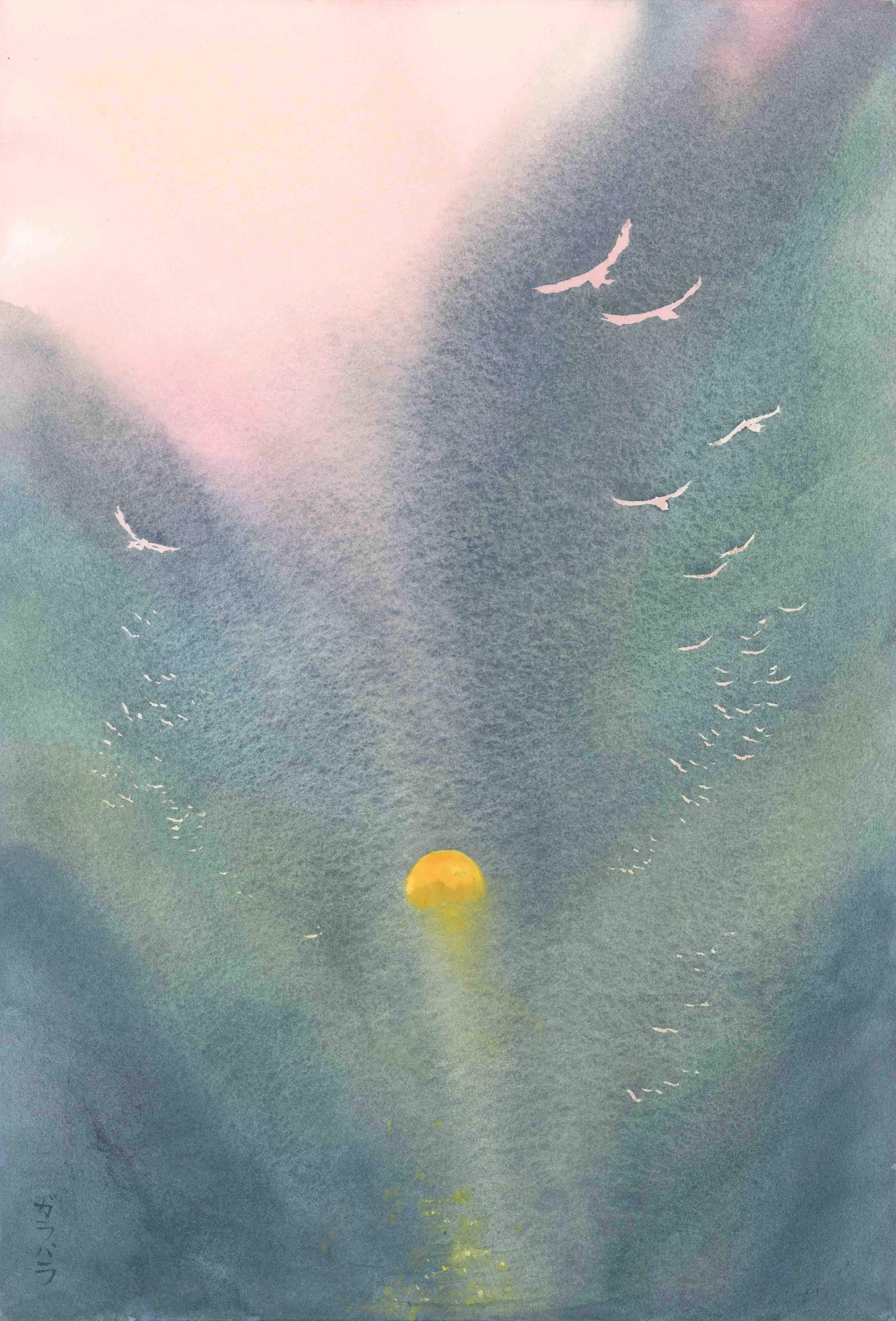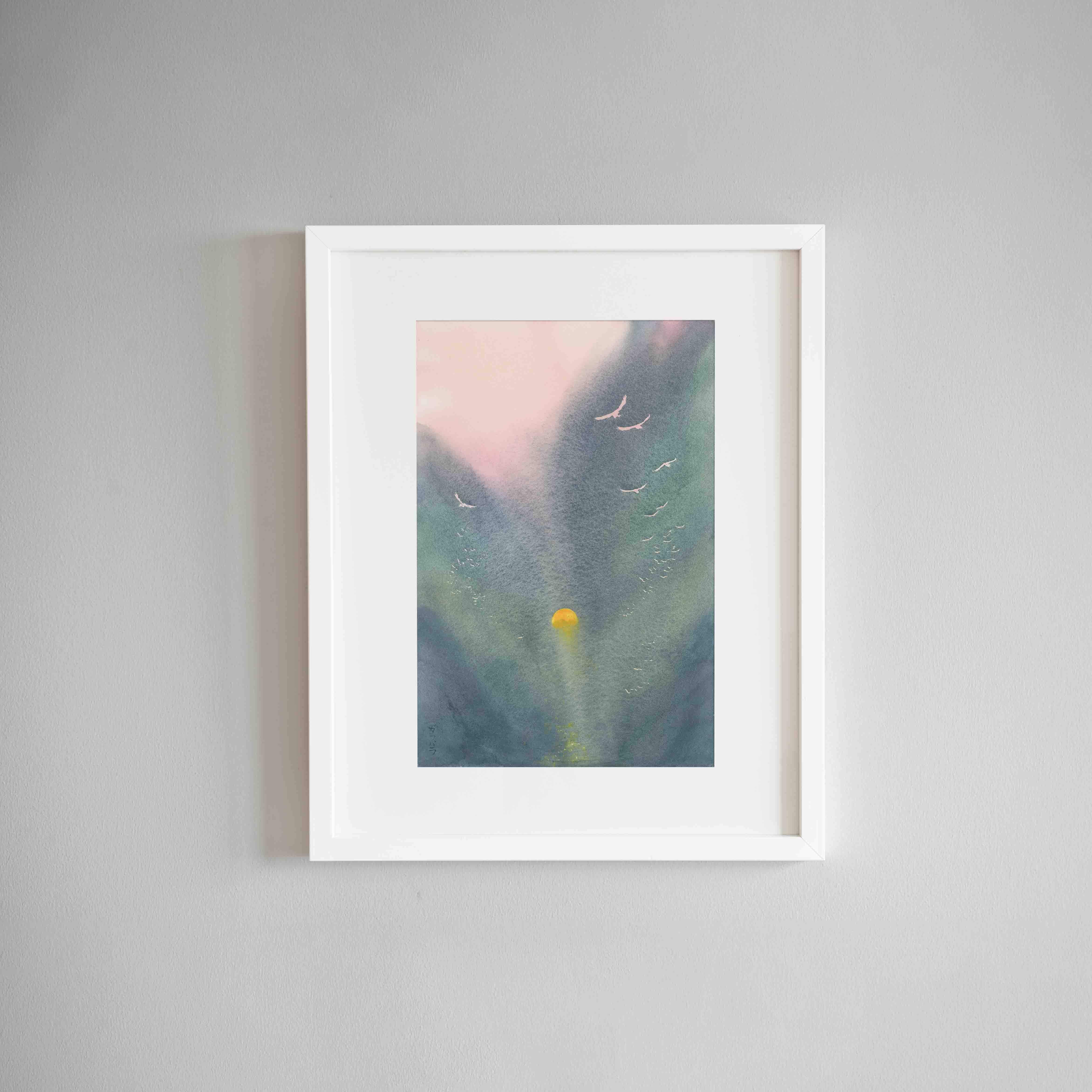 Ptaki - akwarela z kryształkami sygulitu - 42x30cm - Malarstwo spokoju. Obraz wykonany został farbami akwarelowymi na papierze przeznaczonym do tej techniki. Wymaga dodatkowej oprawy.