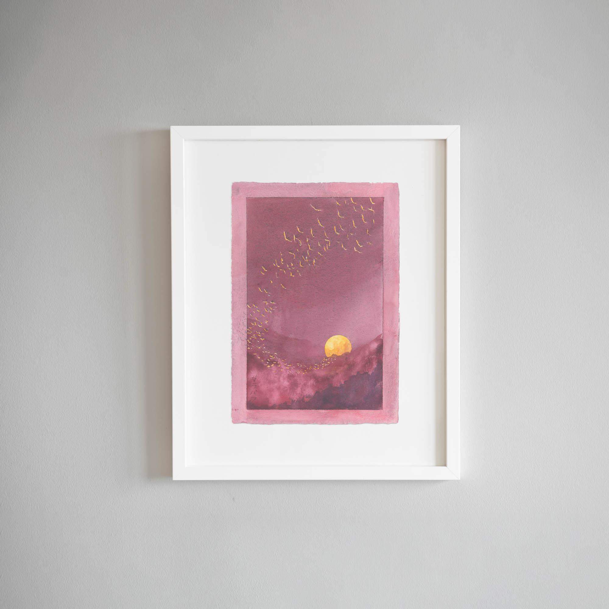 Ptaki i sposób w jaki maluje autorem otaczają spokojem i dają nadzieję. Wzlatują gdzieś w górę wplecione w oniryczny pejzaż. Obraz wykonany został farbami akwarelowymi na papierze przeznaczonym do tej techniki. Wymaga dodatkowej oprawy - zdjęcie z galerii jest poglądowe.