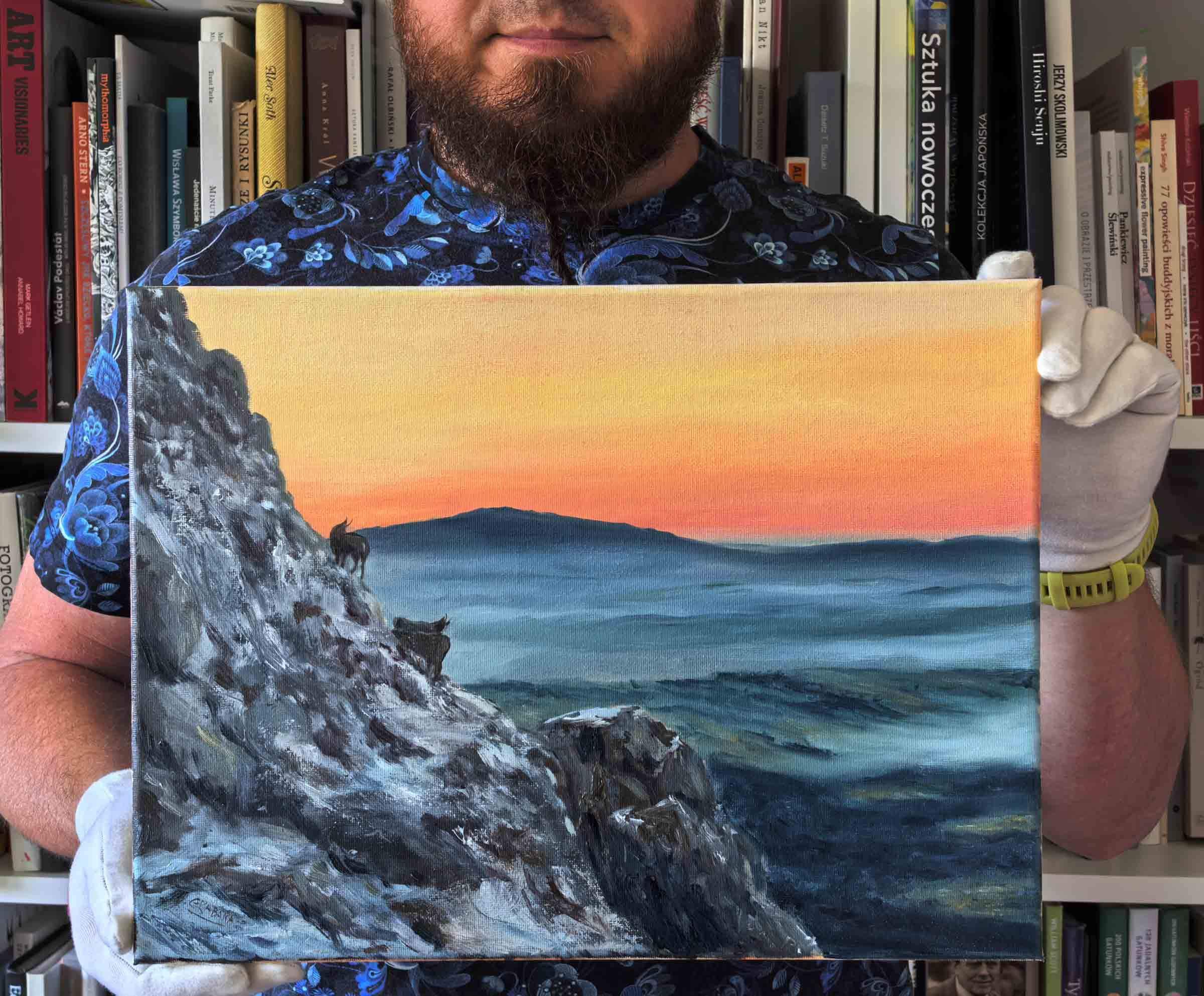 Obraz wykonany został farbami olejnymi na płótnie. Wymaga dodatkowej oprawy.
