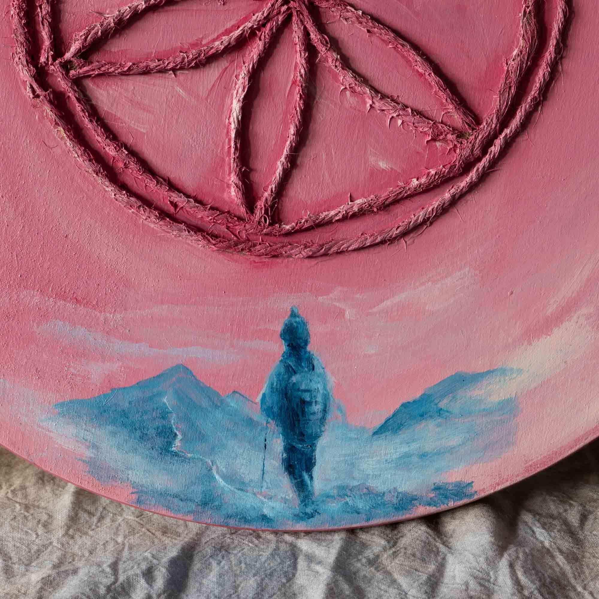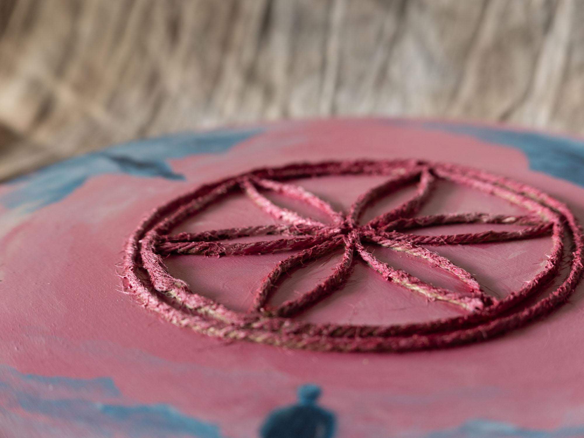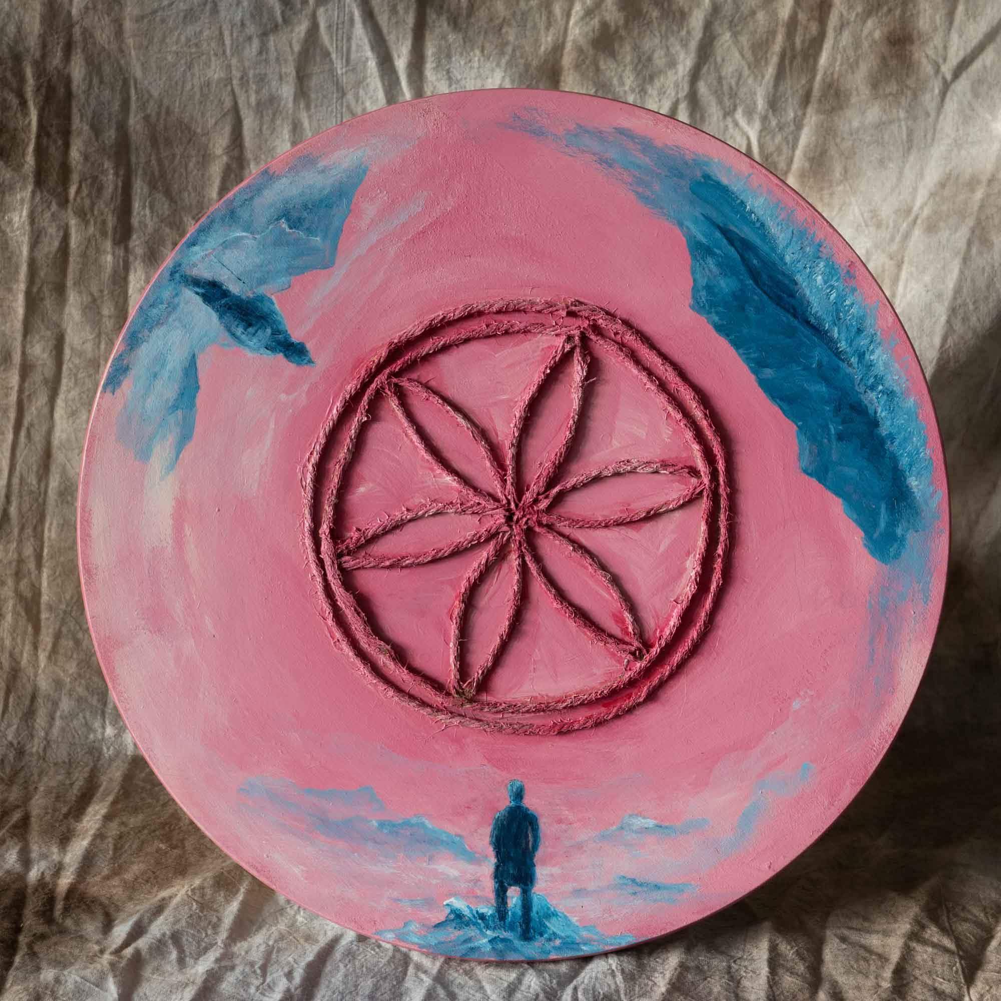 Dzieło wykonałem na obrotowej drewnianej paterze o średnicy 30cm z wykorzystaniem sznurka i farb akrylowych.