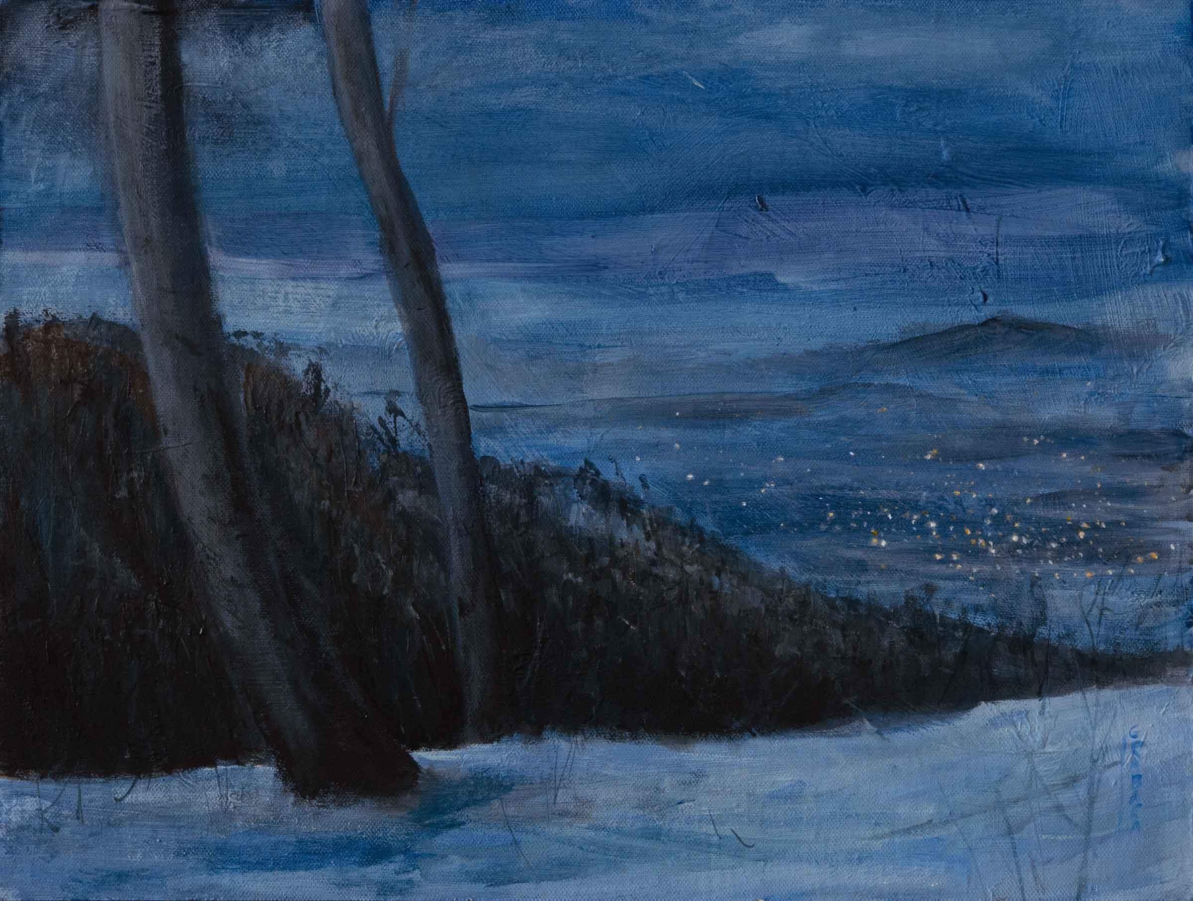 Widok na Brenną o zmierzchu - akryl na płótnie - 40x30cm Lubię chodzić po górach Beskidu Ślaskiego o różnych porach dnia. Tutaj, w zimie, pomiędzy Lipowskim Groniem i Równicą urzekł mnie widok na Brenną. Światłą migocące w dole pięknie kontrastowały z pniami drzew i ciemnoniebieskim śniegiem.