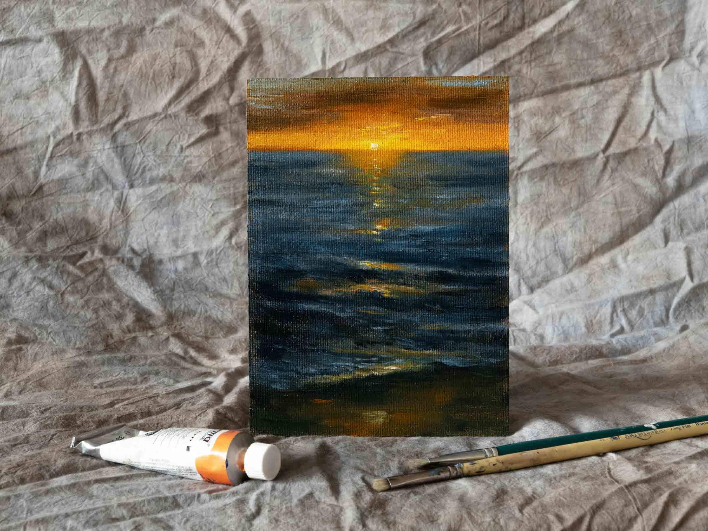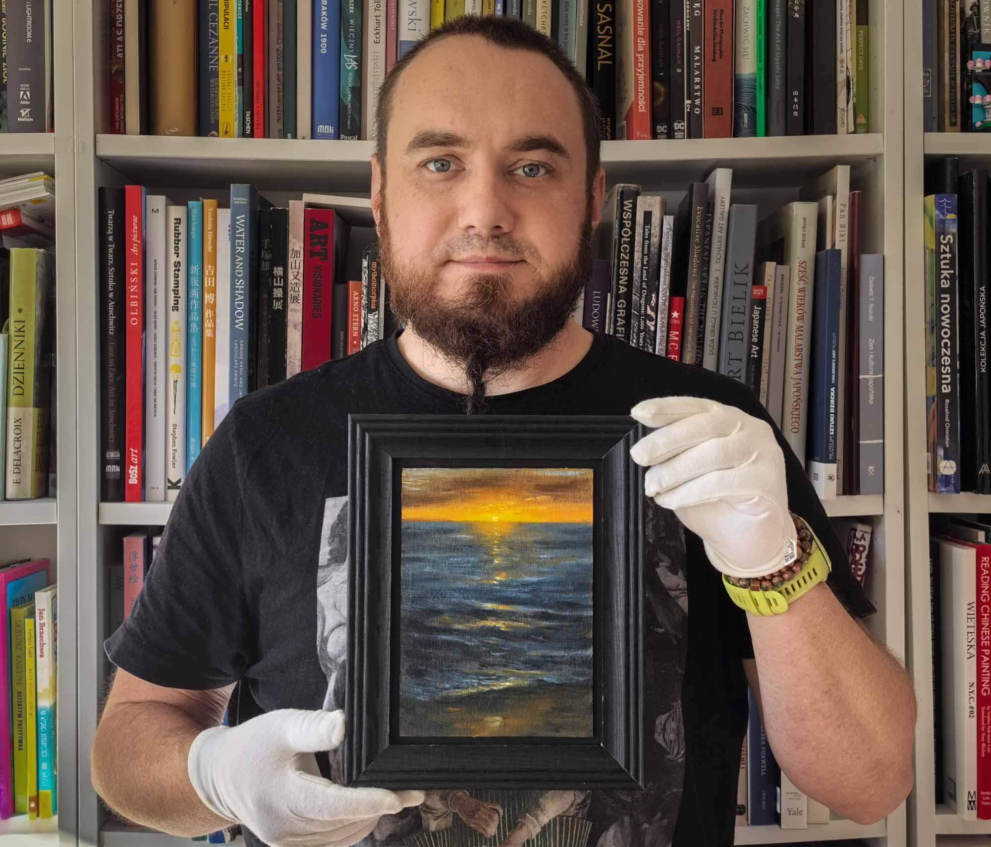 Obraz wykonany został farbami olejnymi na płótnie - panelu malarskim. Jest oprawiony w czarną drewnianą ramę i gotowy do zawieszenia na ścianie lub postawienia na półce lub biurku.